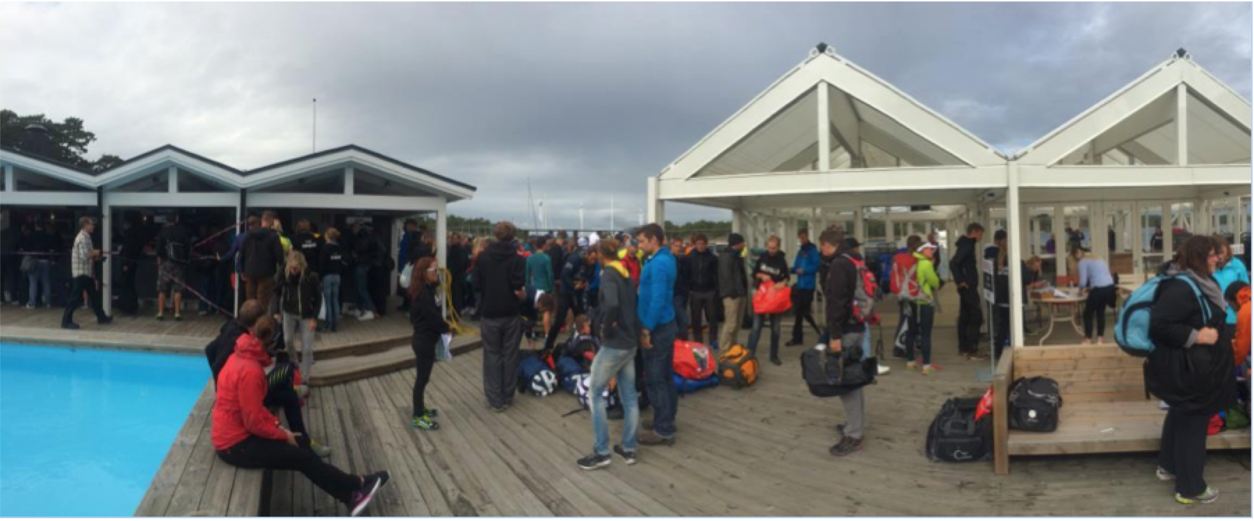 Tout ce beau monde débarque sur l’île de Sandhamn. Tout le monde est calme, il n’y a pas d’éclat de voix. Tout est ordonné, les athlètes « suivent » les indications sans d’autres signes d’expression ou de ressenti. Dès qu’on a posé le pied à terre, on se retrouve face au départ qui nous attend demain matin ! On reconnait tout de suite les lieux qu’on a vus et revus sur les video internet… ca y est, on y est !!! A ce moment, c’est un mélange assez bizarre d’excitation et de stress.