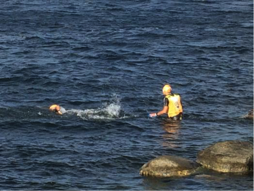 Une dame de l’orga m’aide à me relever. Je la regarder mortifié, tétanisé, gelé, je lui lance « very difficult swim ! » Elle acquiesce et me frotte quelques secondes le dos comme si elle voulait partager la difficulté avec nous. Le surnom de « pig swim » est amplement mérité ! En comparaison, la nat de Deauville, c’est le petit bain !